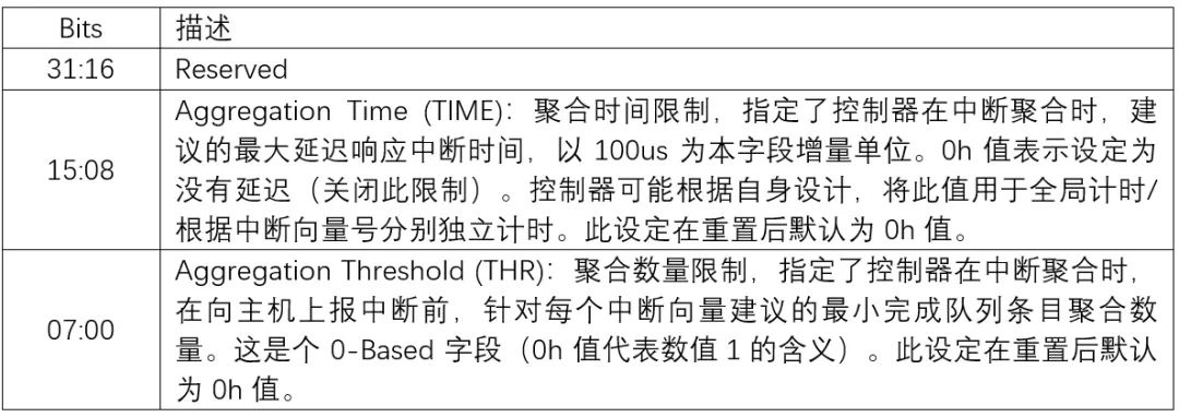 这是一个全局的设定参数,即设定会同时作用于所有 I/O 中断向量,无法分别单独设置。当 Aggregation Time 或者 Aggregation Threshold 的其中一个条件满足时,控制器就应当向主机上报中断信号。当两个设定任意其一为 0h 值时,相当于中断聚合功能关闭,每一条中断都会被直接上报。需要注意的是此功能只应用于 I/O 相关的中断向量,Admin 中断向量不建议也不支持使用中断聚合功能。当主机与设备之间的关系变化(更换设备/重置),或者中断类型变化时,此 Feature ID 的内容不要求被保持,并且建议主机重新设定此 Feature ID。