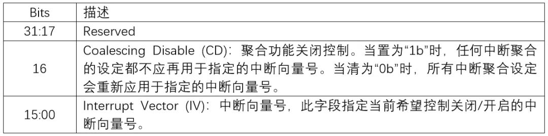 这个 Feature 一次只能设定指定的一个中断向量号。默认情况下,中断聚合的设定会对所有中断向量启用(除了不支持中断聚合的 Admin Completion Queue 对应的向量 —— IV0)。在主机发送命令设置此 Feature 之前,需要确定希望指定的中断向量号已经绑定于现存的 I/O Completion Queue 之上,或者指定的中断向量号不是 Admin CQ 对应的 IV0,否则控制器会终止此非法命令并返回错误状态码。