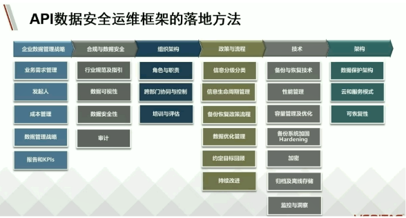 具体到数据安全运维框架的落地,尤其在敏态业务日益受关注的趋势下,相比较技术和架构,管理目标和制度架构设计更为重要。包括企业数据管理战略、合规与组织安全、组织与架构、政策与流程等,都是企业需要长期投入和不断优化改进的基础方向。Veritas 提供完整的方法论框架指导,具体落地可分阶段、分模块实施。