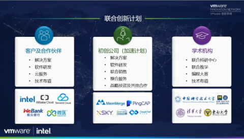 VMWare创新网络(VIN)目前汇聚了英特尔、阿里云、腾讯云、微众银行、中国移动等行业领导者,与技术创新企业Memverge、XSKY等,一起协同国内高校包括清华大学、中国科学技术大学作为联合创新方,共同促进软件定义领域创新创业、推动产业发展发展、助力中国数字化转型。