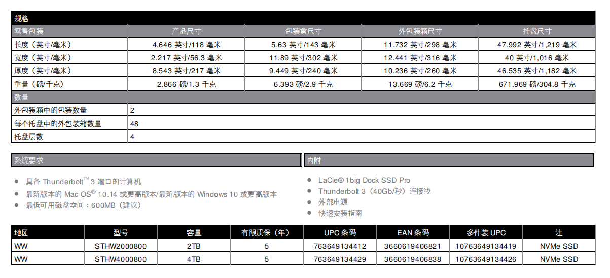 | 1BIG Dock SSD PRO | STHW2000800 | 2TB LaCie 1big Dock SSD Pro Thunderbolt 3 | 面议 |