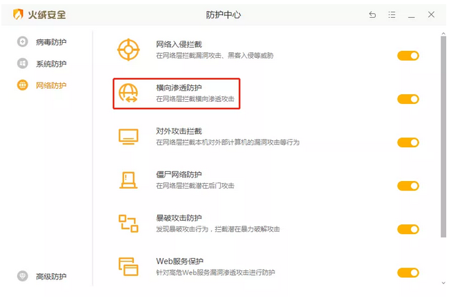 为了避免局域网用户遭受横向渗透攻击的威胁,火绒推出专门的“横向渗透防护”功能。该功能作用体现在两方面:一是拦截,二是发现。