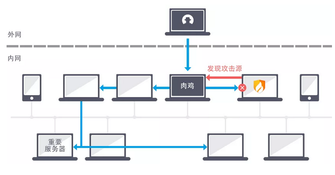 拦截的不仅是想要通过外网进入的各类攻击,保证新的威胁无法进入,还包括局域网内已存在的渗透威胁,做到终端之间相互隔绝已有的攻击,杜绝“横向”传播的可能;发现则是追本溯源,找到已被黑客控制并作为渗透的跳板终端,及时终止渗透行为。