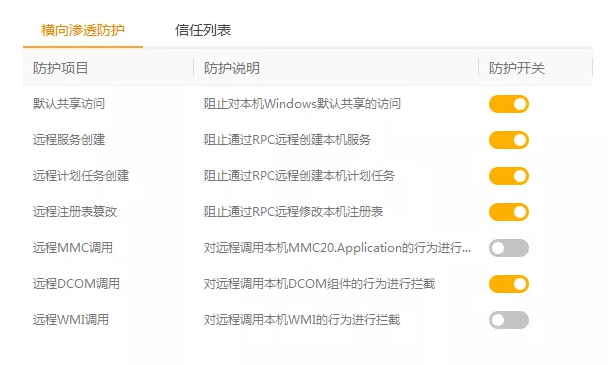 用户可在火绒5.0最新版的【防护中心】-【网络防护】中一键开启“横向渗透防护”功能。目前该功能可对“默认共享访问”、“远程服务创建”、“远程计划任务创建”、“远程注册表篡改”、“远程MMC调用”、“远程DCOM调用”、“远程WMI调用”七大关键点进行防护,可从创建、修改、执行三方面抵御局域网扩散的可能性。此外,对于有特殊需求的用户,还可通过白名单(信任列表)灵活设置准入规则。