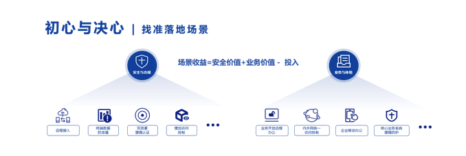 另外一类场景,以业务价值为主,安全价值相对较弱。典型的如业务开放远程办公,会显著增强业务开展效率,但同时暴露更多业务容易引入安全隐患;还包括内外网统一访问、企业移动办公等以业务和体验驱动的场景。