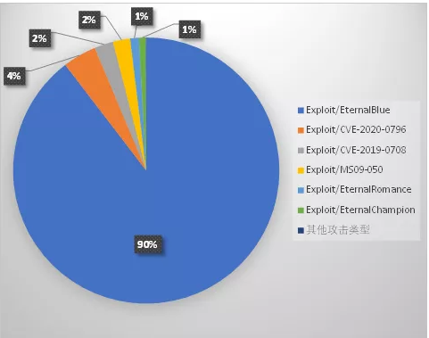 根据火绒拦截的数据显示,自7月13日至23日,漏洞攻击次数较以往上涨282%。其中,通过“永恒之蓝”漏洞发起的攻击占总次数的90%,其次为CVE-2020-0796和CVE-2019-0708等近些年出现的高危漏洞。
