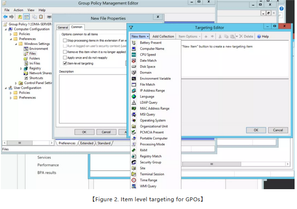 您还可以使用安全组— Windows Management Instrumentation (WMI) 过滤对 GPO 的应用方式进行更精细的过滤。这种过滤可以基于操作系统、设备的品牌和型号、时区等条件来应用决策,也支持项目级目标选择,从而实现按设置过滤。图 2 提供了这些设置类型的示例。