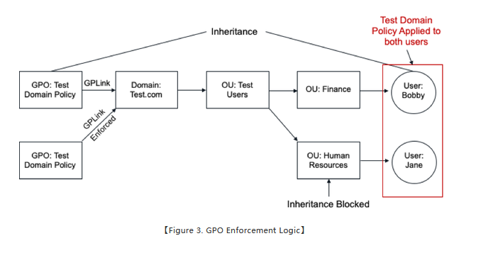 实施 GPO 是解决此管理问题的一种方法。实施 GPO 意味着具有关联 GPO 的父容器无法阻止或覆盖其设置,而是始终应用实施的 GPO。以下示例直观展示了无论是继承或阻止继承,实施的 GPO 始终将被应用。