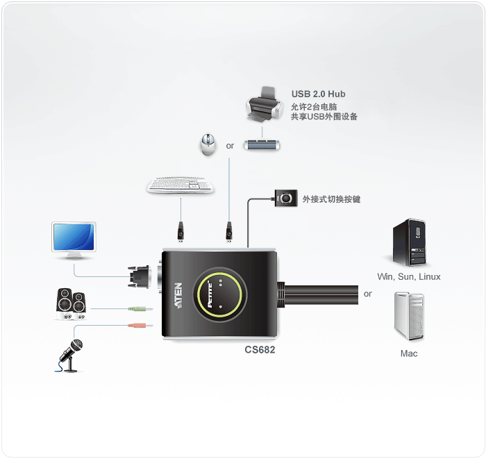 CS682整合了DVI功能、方便的USB 2.0接口设备分享、以及操作简易的特性,为使用者提供桌上多媒体应用的创新技术。