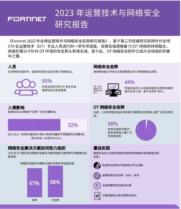近日,《Fortinet 2023 年全球OT与网络安全态势研究报告》(以下简称报告)发布。(获取报告全文请点击“阅读原文”)这项基于第三方权威研究机构针对全球570 名OT专业人员进行的一项专项调查报告显示,随着 IT/OT 网络的持续融合,网络犯罪分子针对 OT 环境的攻击势头有增无减,OT 安全防护已成为全球组织的重中之重。