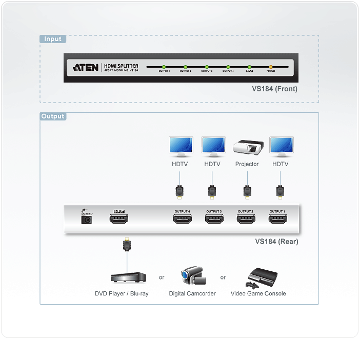 VS184 HDMI影音分配器对于需要将数字高分辨率视频讯号复制输出至2台显示设备的使用者而言,是一套相当理想的解决方案。VS184可支持具备HDMI功能的设备,如DVD播放器、卫星机顶盒及所有HDMI显示器。