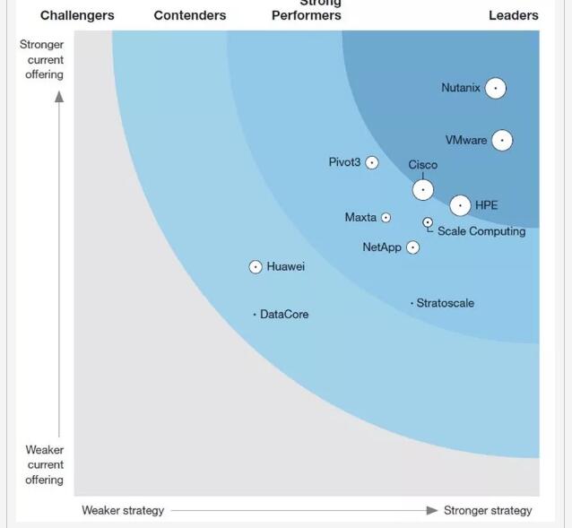 2018年9月25日Forrester Research发布《The Forrester Wave: Hyperconverged Infrastructure, Q3 2018》技术调查分析及展望报告,思科 HyperFlex 3.5 进入了超融合领导者象限。