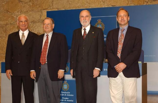 劳伦斯•罗伯茨和其他互联网先驱(从左到右)罗伯特•卡恩、文顿•瑟夫和蒂姆•伯纳斯-李于2002年在西班牙的一次会议上相聚。罗伯茨博士坚持认为,工程师们应寻找互联网前身阿帕网(Arpanet)的实际用途。