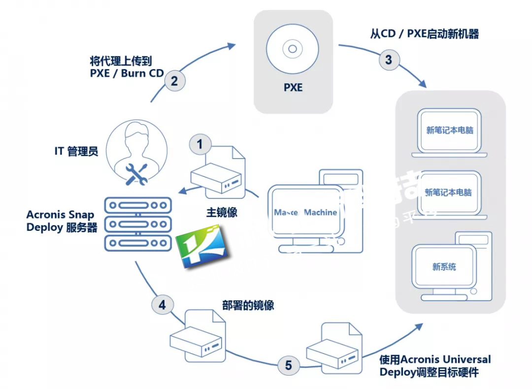 您希望您的IT员工能够做更多的工作,而不是一直安装操作系统和软件,不是吗? 那么使用Acronis Snap Deploy,您只需创建一个精确的磁盘镜像,并且只需要一个步骤即可将该镜像同步部署到多台机器,其速度和您部署一台系统一样快。使用Acronis Snap Deploy, 您可以将镜像重新部署到可用的Windows机器上,无需再手动启动每个单独的系统。