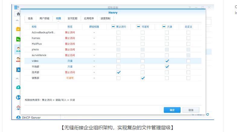 管理企业就像“统帅三军”,生产经营就是“带兵打仗”,就算做不到“韩信带兵,多多益善”,你至少应该做到“权责分明”——这里说的就是企业网盘的权限管理问题,在群晖的DSM操作系统上,你可以快速分配相应的权限,从管理的精细程度看,群晖的企业网盘解决方案可以做到: