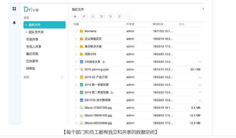 除了汇总所有数据,每个部门和每个员工可以有自己的独立云盘。在“我的文件”与“团队文件夹”里,管理员可以为员工设置互不可见的存储空间与共享文件夹,既能保证个人的工作空间,又允许设置部门独立文件管理并设置跨部门读写权限。