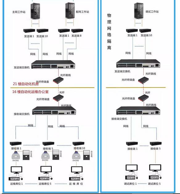 由于此次有两个KVM矩阵系统,所以需要用到两路交换机。而工作站与操作席位距离较远,因此秦安科技采用交换机级联的方式进行解决,在21楼与16楼之间架设光纤,并在光纤两端接入光端盒,在机房和办公室各安装一个交换机,然后使用光纤跳线将两个交换机接入光端盒,这样两个交换机就形成级联。在每个运维席位使用一个DV2302连接接收端和办公主机进行切换使用,每个运维席位可以在18台主配网工作站之间任意切换,在D5000系统中对电网的频率、电压、发电与负荷容量、电量进行安全监视,及时的调度出现异常和故障的电网;同时通过DV2302可以切换到办公主机进行办公。调试席位控制10台工作站,分别作为主网备调、配网备调、网络管理、安全监测使用。