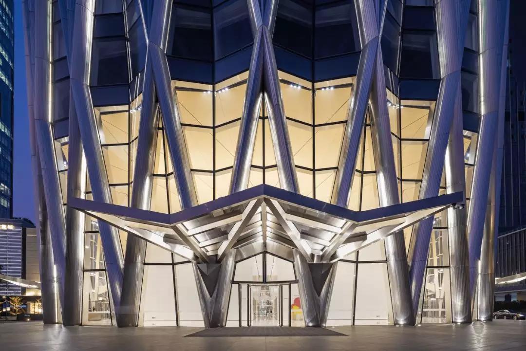 照明嵌入板材之内,营造出高明度且光线均匀、光色舒适的光环境。低色温的暖光,融化了不锈钢材质的冰冷感,表现出奢华的质感,为入驻企业树立国际高端办公形象。