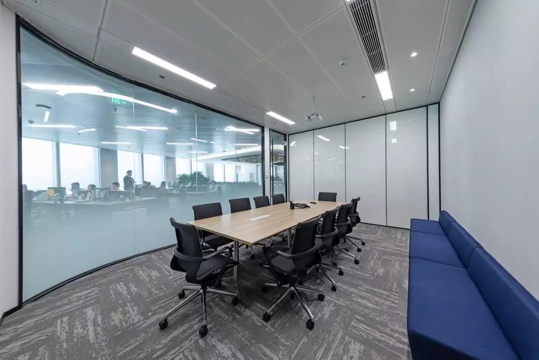 中国华润大厦在会议室沿用高显色性,防眩光设计,高光通量的平板灯作为重点照明,并使用木质会议桌,使桌子表面的镜面反射减到最小,营造出柔和又明亮的会议空间。