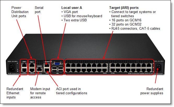 下图显示了GCM 32 1754D2X全局控制台管理器上的连接。GCM 16 1754D1X全局控制台管理器有相同的连接,除了它只有16个ARI端口,而GCM 32 1754D2X有32个ARI端口。