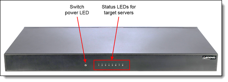该交换机有八个目标端口,并支持一个本地用户。本地视频分辨率可达1920年x 1080。两级分层允许您管理多达64台服务器,从一个本地控制台连接到多个控制台交换机。下图显示ThinkSystem模拟1x8 KVM开关。