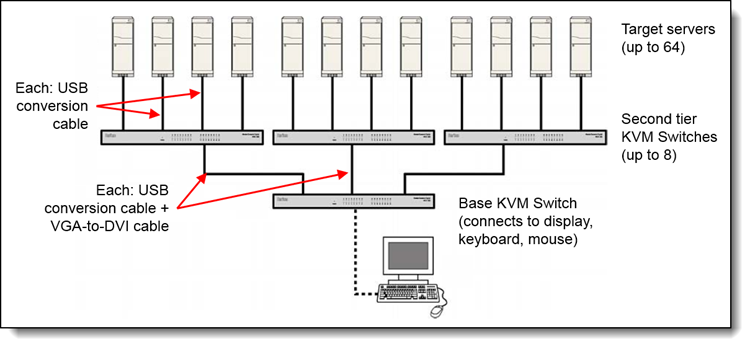 您可以将最多8个额外的模拟1x8 KVM交换机连接到一个模拟1x8 KVM交换机上,以启用对其他服务器的访问。这种配置称为两层设置,其中八个二级交换机通过USB转换电缆和VGA到DVI转换电缆的组合连接到基本交换机。可以从一个中心位置管理多达64个目标服务器。