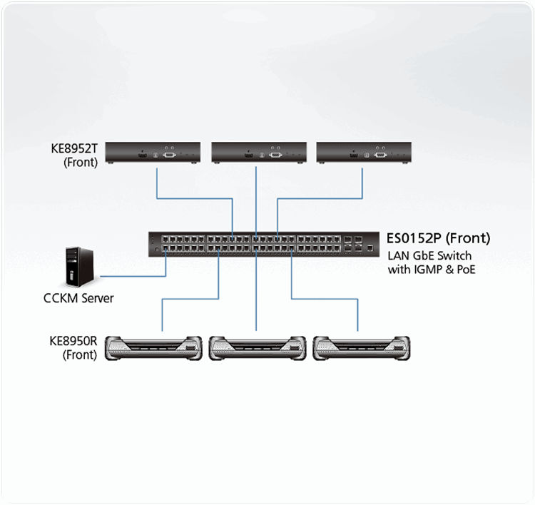 Deploying the ES0152P is fast and easy. With everything plug and play, there is no need to install software or configure devices. Simply connect the KE / VE89 transmitters and receivers to the ES0152P using Cat 5e/6 cables and all KE / VE89 series devices on the same LAN will automatically be detected.