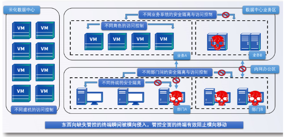1、无法做到细粒度的隔离措施:传统网络隔离最小粒度只能做到域的隔离,意味着只能针对南北向流量进行隔离,而同一域内的东西流量无法有效隔离,从而无法有效防范威胁横向扩散,内部一旦被突破一点,感染成面,损失巨大;