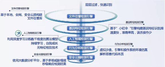 深信服EDR漏斗式的检测机制,90%文件可被第一层引擎过滤,无需所有引擎并发检测,检测速度快,性能消耗低。同时,结合深信服安全云脑引擎的大数据分析,实现一台发现威胁,全网感知,快速检测出恶性病毒。