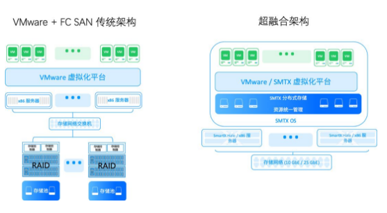 首先,以 SmartX 产品为例介绍一下超融合架构和传统三层架构的核心区别,以便了解原有架构整合时有哪些需要被替换的设备