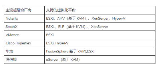 以下是市场主流超融合厂商的虚拟化平台支持情况: