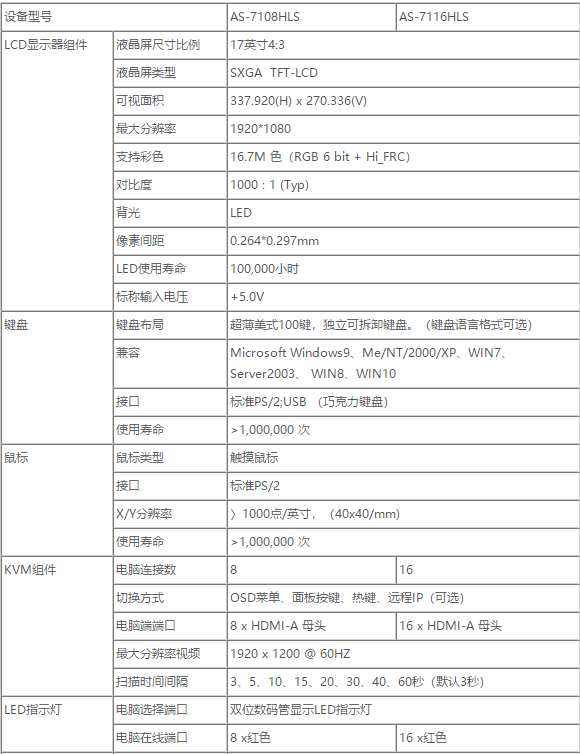 AS-7108HLS整合LCD、超薄键盘、Touch Pad触摸鼠标板,集成在1U高度单元内,抽屉式安装方式,彻底解决空间不足的问题。采用高品质A级17”TFT LED、分辨率最高可达1920*1080,与标准键盘、显示器、鼠标相比,可节省85%的空间,内置8口HDMI USB切换器.提供面板按键,OSD菜单使切换更为方便