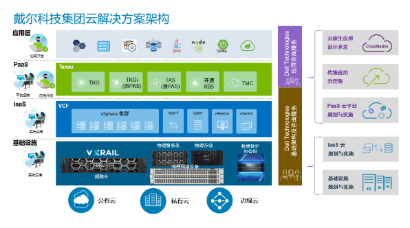 就底层架构来说,戴尔覆盖了从IaaS到SaaS的三层平台,结合了VMware Cloud Foundation(VCF)和Dell EMC VxRail超融合平台,并采用全堆栈集成,提供一站式混合云方案。