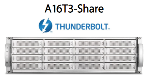 一台A16T3-Share附有4个Thunderbolt™3接口,当使用T-Share扩展功能串连两台时,接口便能扩展为8个;体积,存储容量亦随之扩展,若再搭配JBOD使用,总容量将高达1 Petabyte以上(1792TB)。