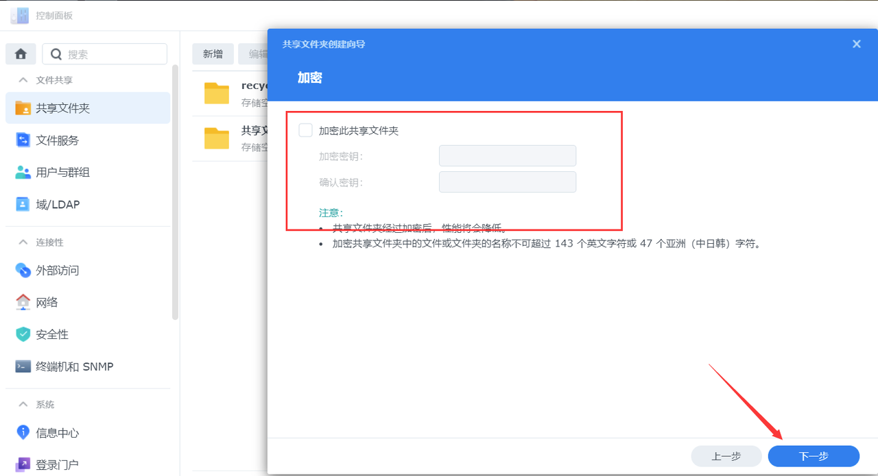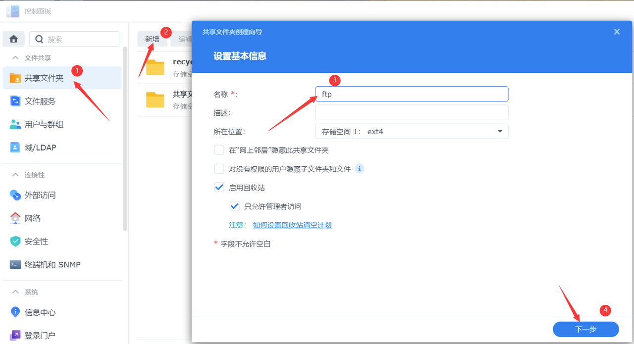 1.进入控制面板,选择共享文件夹,新增,填写好共享文件夹名,下一步。