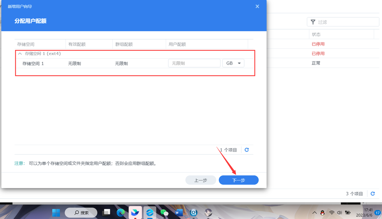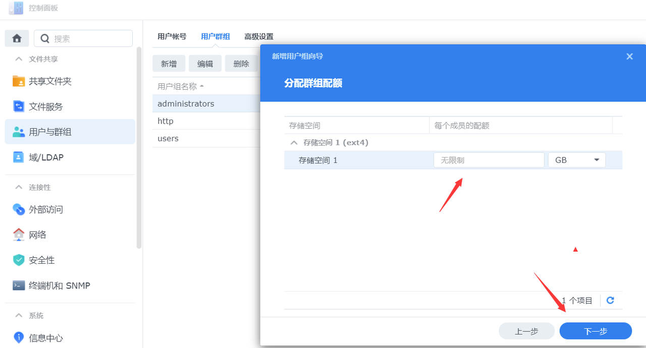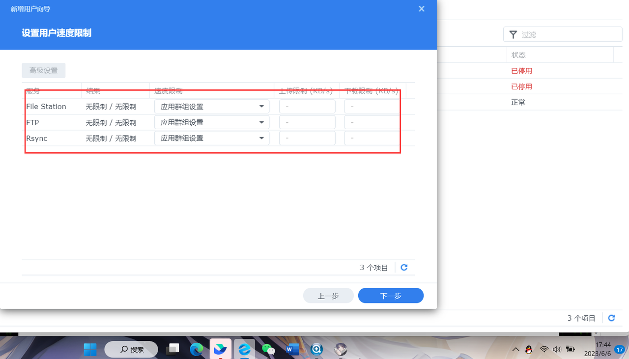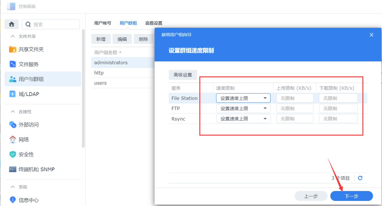 9、群组的访问限速设置,根据需求来,然后下一步。