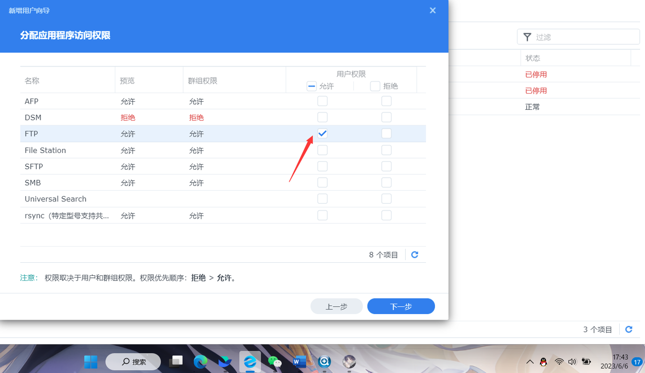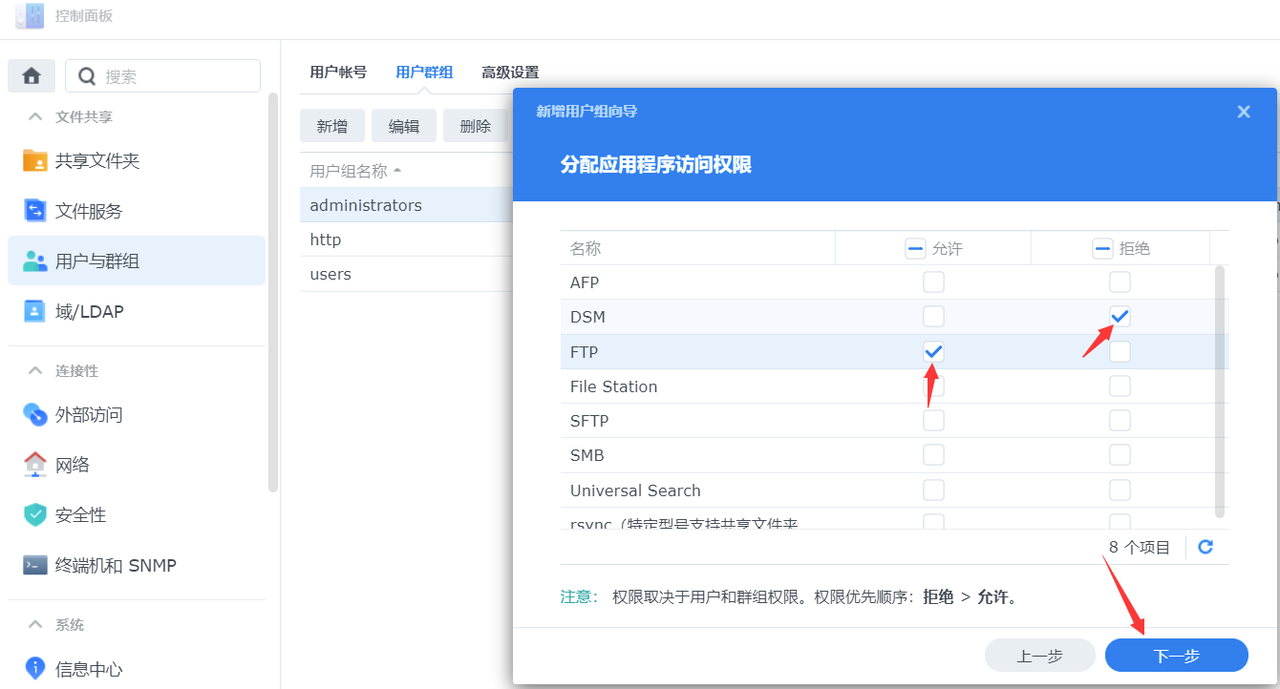 8、给用户群组设置应用访问权限,DSM勾上拒绝,FTP勾上允许。这样设置的话属于该用户群组的用户就只能访问FTP而不能访问NAS,增加安全性。