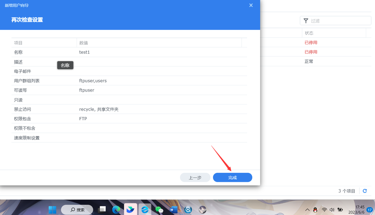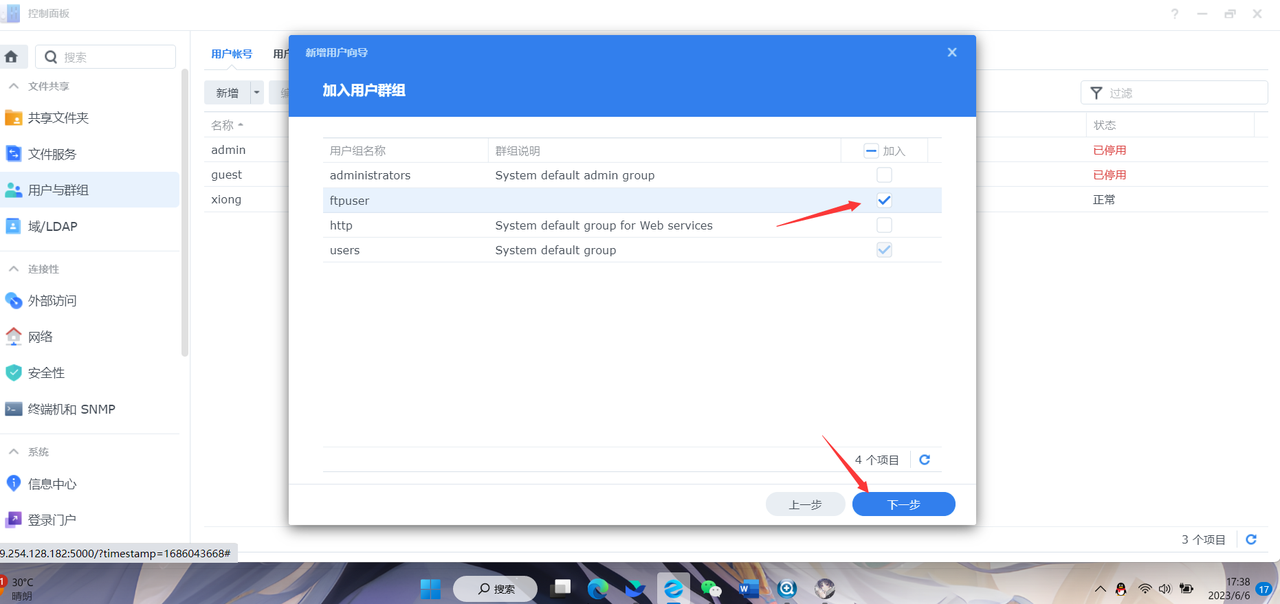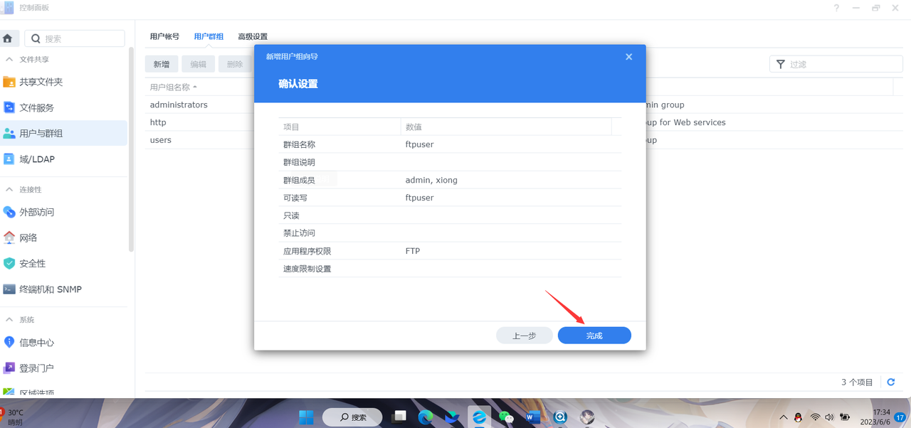 3、继续下一步。再应用。进入控制面板,选择用户群组,新增,填写好用户群组名称,下一步