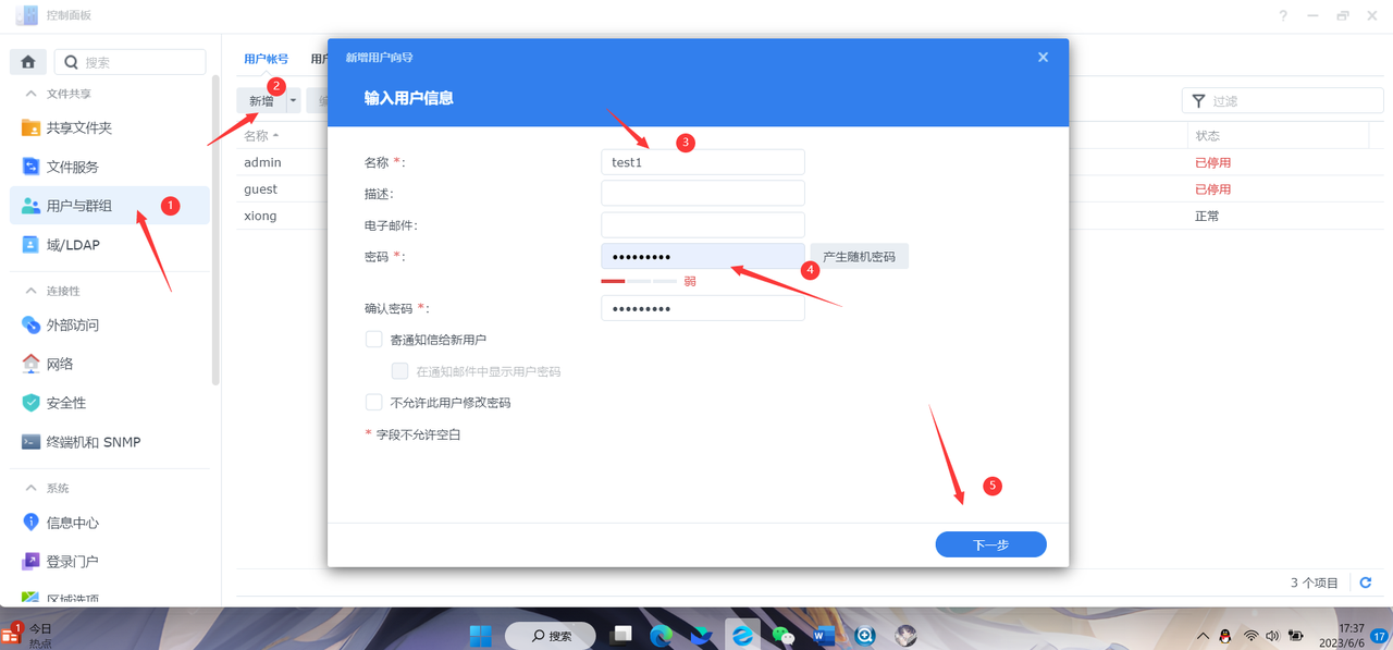 1、进入控制面板,选择用户帐号,新增,填写好用户名和密码,下一步。