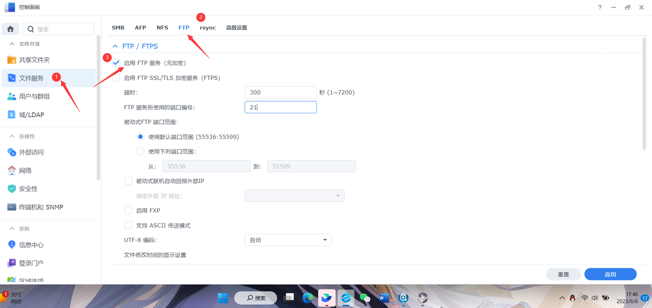 1.进入控制面板,选择文件服务,选择右边的FTP,勾选上启用FTP服务(无加密),设置好FTP服务所使用的端口编号。