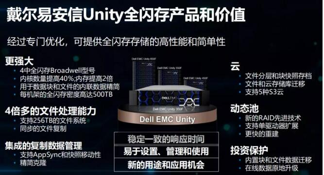 面向广泛企业及组织用户,戴尔易安信Unity及SC中端存储产品系列向客户提供灵活便捷及经济有效的转型路径,为客户带来更多选择。采用英特尔®至强®处理器的戴尔易安信Unity全闪存和混合闪存存储平台通过优化闪存的性能和效率,提供完全集成的存储区域网络 (SAN) 和网络连接存储 (NAS) 功能,通过提供卓越的高性能和简化性,帮助企业加速业务、简化管理并将存储无缝分层至云。同时,Unity具备更为灵活的操作环境,可部署于众多配置中,包括融合及超融合系统、专用存储阵列或软件定义的虚拟存储等应用装置。